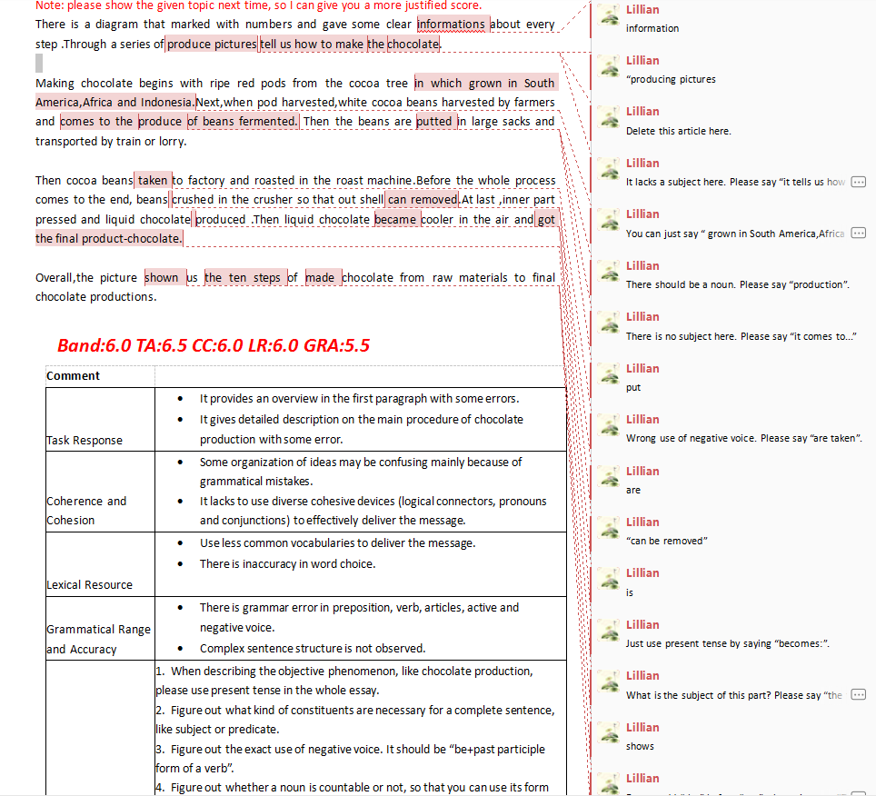 | 雅思英语类别: 雅思口语一对一陪练,托福口语,日常英语口语,商务英语口语,以及幼儿英语口语。 同时本公司也承接雅思口语陪练,留学服务,雅思作文批改精批等业务。 如下为同学雅思原文: There is a diagram that marked with numbers and gave some clear informations about every step .Through a series of produce pictures tell us how to make the chocolate.Making chocolate begins with ripe red pods from the cocoa tree in which grown in South America,Africa and Indonesia. Next,when pod harvested,white cocoa beans harvested by farmers and comes to the produce of beans fermented. Then the beans are putted in large sacks and transported by train or lorry. Then cocoa beans taken to factory and roasted in the roast machine.Before the whole process comes to the end, beans crushed in the crusher so that out shell can removed.At last ,inner part pressed and liquid chocolate produced .Then liquid chocolate became cooler in the air and got the final product-chocolate. Overall,the picture shown us the ten steps of made chocolate from raw materials to final chocolate productions. 如下为外教修改后的作文: