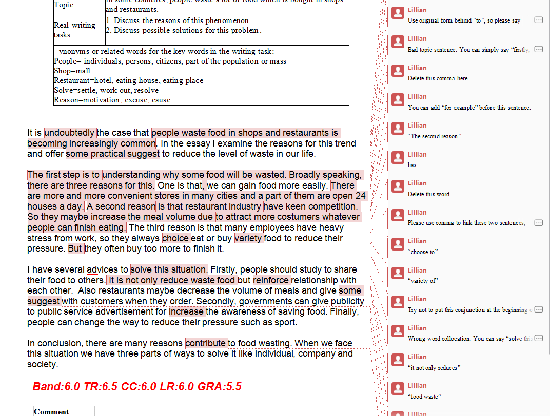 | 雅思英语类别: 雅思口语一对一陪练,托福口语,日常英语口语,商务英语口语,以及幼儿英语口语。 如下为同学雅思原文: In some countries, people waste a lot of food which is bought in shops and restaurants. What do you think are the reasons? What can be done to solve this problem? It is undoubtedly the case that people waste food in shops and restaurants is becoming increasingly common. In the essay I examine the reasons for this trend and offer some practical suggest to reduce the level of waste in our life. The first step is to understanding why some food will be wasted. Broadly speaking, there are three reasons for this. One is that, we can gain food more easily. There are more and more convenient stores in many cities and a part of them are open 24 houses a day. A second reason is that restaurant industry have keen competition. So they maybe increase the meal volume due to attract more costumers whatever people can finish eating. The third reason is that many employees have heavy stress from work, so they always choice eat or buy variety food to reduce their pressure. But they often buy too more to finish it. I have several advices to solve this situation. Firstly, people should study to share their food to others. It is not only reduce waste food but reinforce relationship with each other. Also restaurants maybe decrease the volume of meals and give some suggest with customers when they order. Secondly, governments can give publicity to public service advertisement for increase the awareness of saving food. Finally, people can change the way to reduce their pressure such as sport. In conclusion, there are many reasons contribute to food wasting. When we face this situation we have three parts of ways to solve it like individual, company and society. 如下为外教修改后的作文: